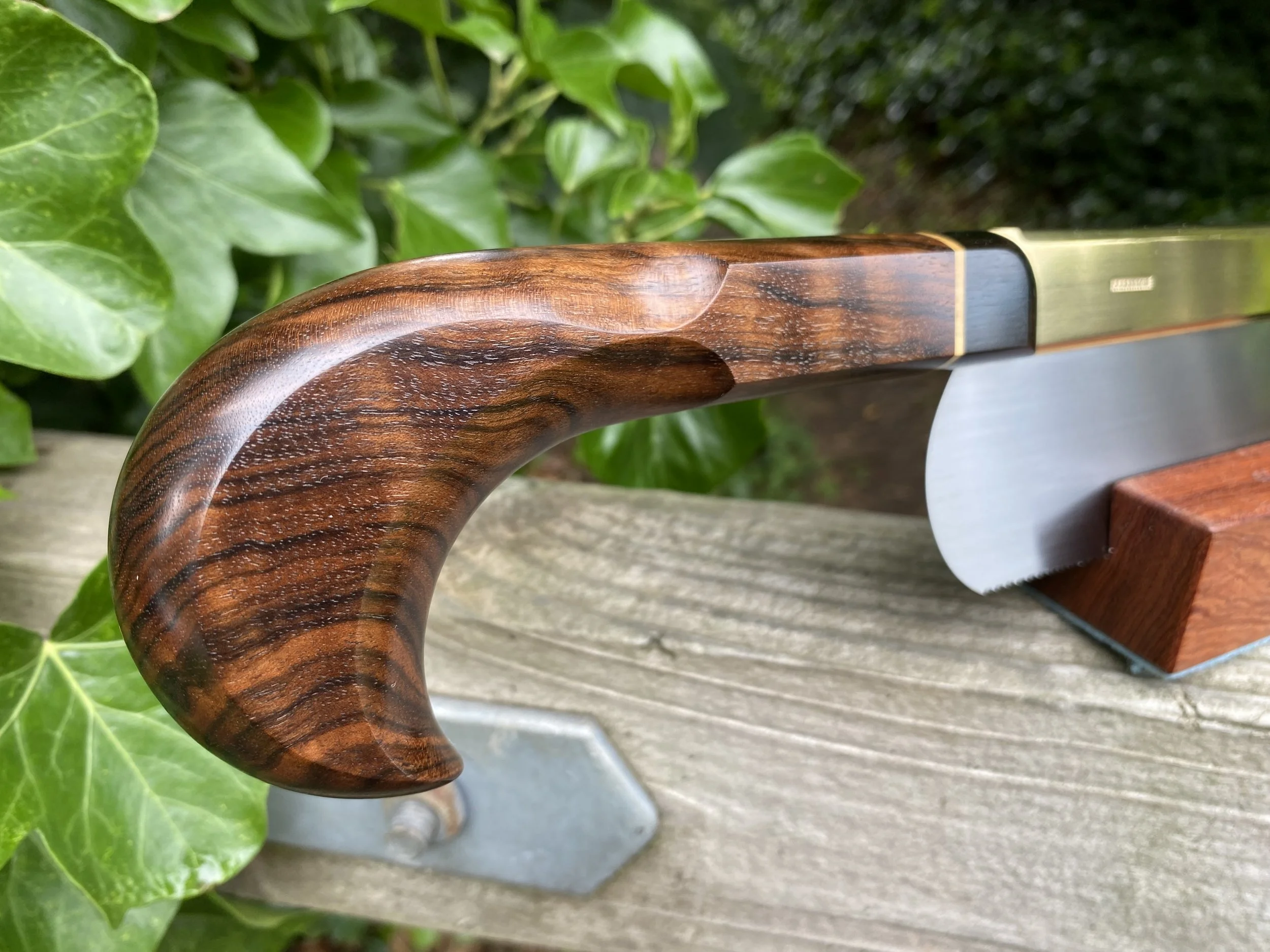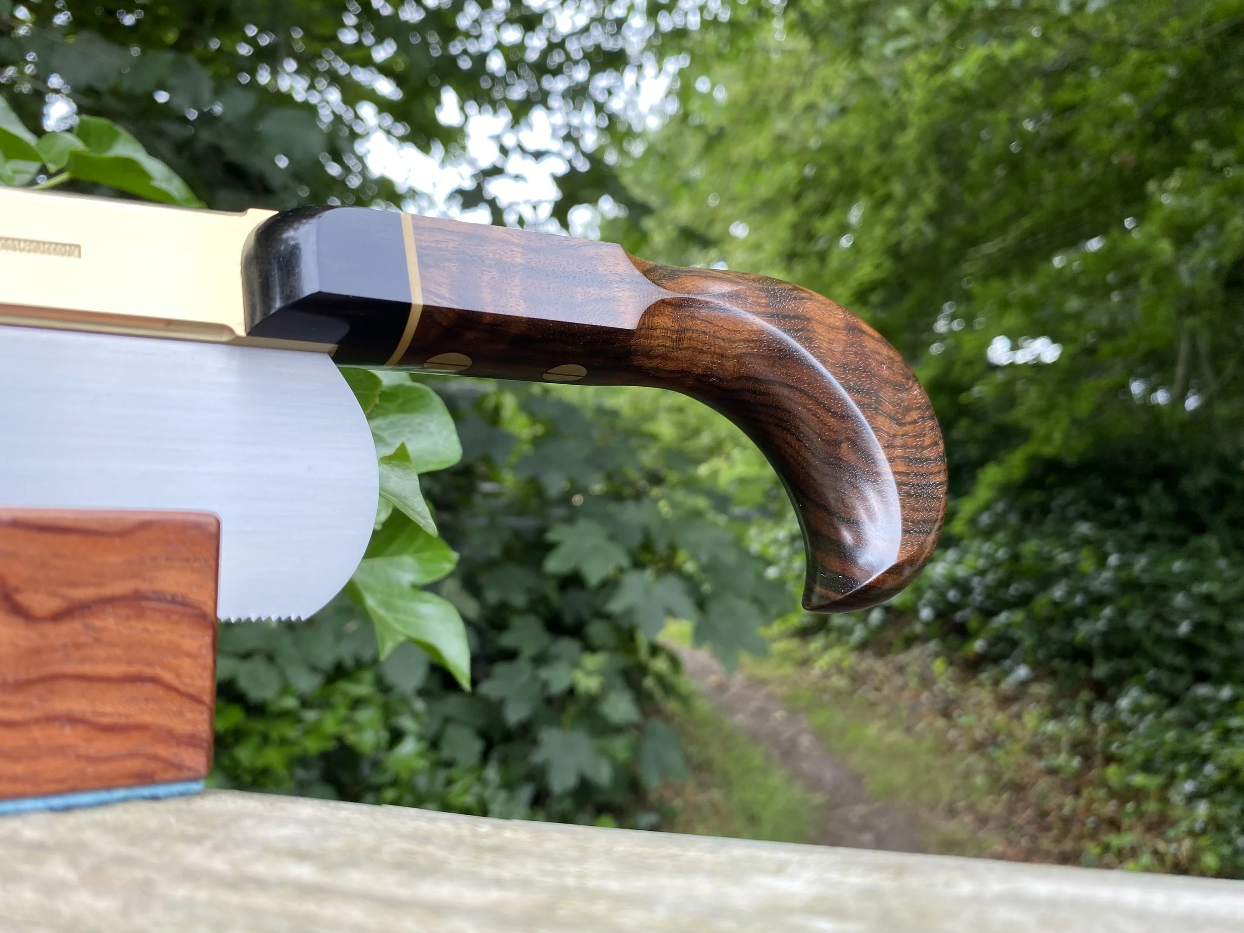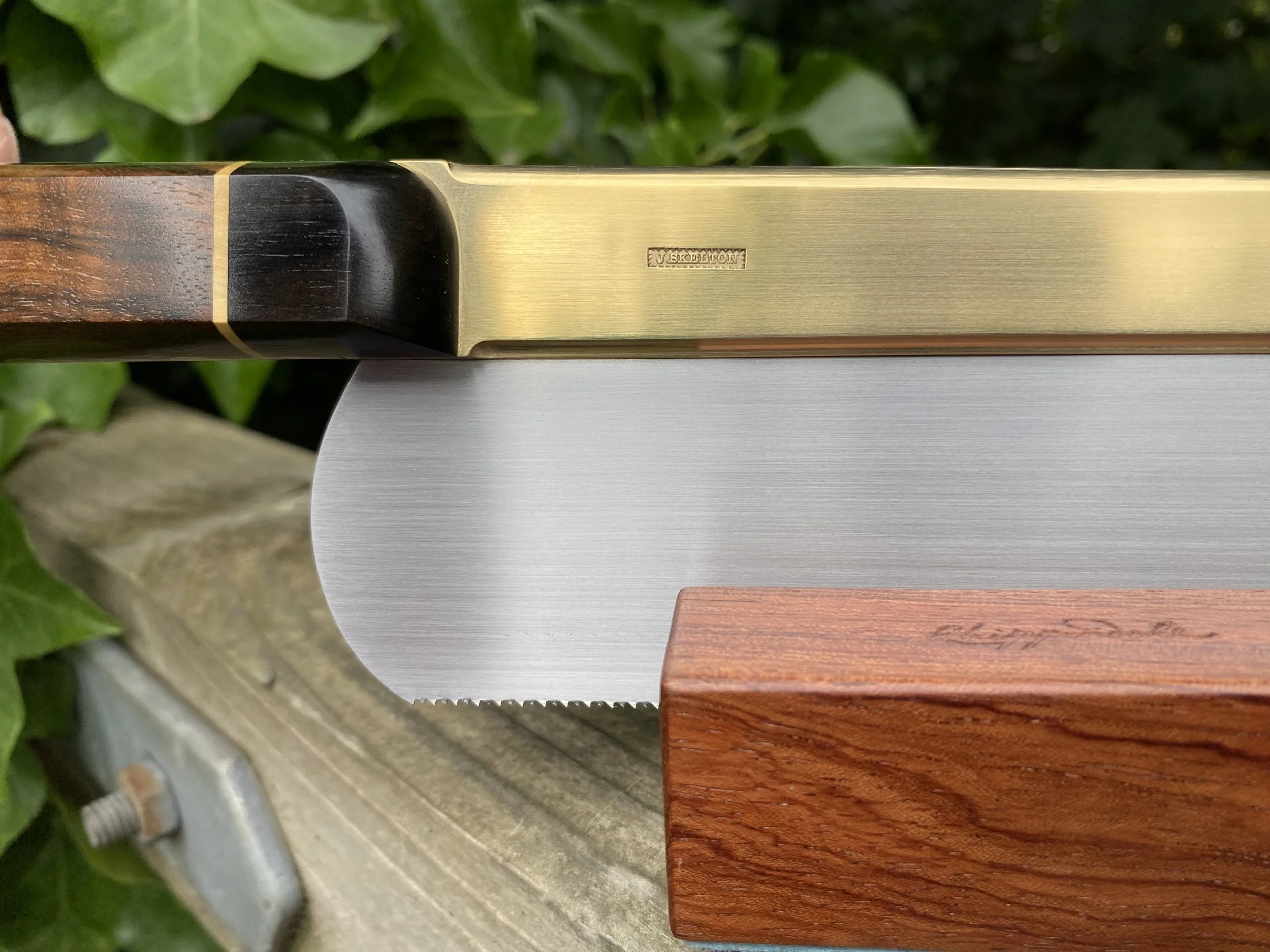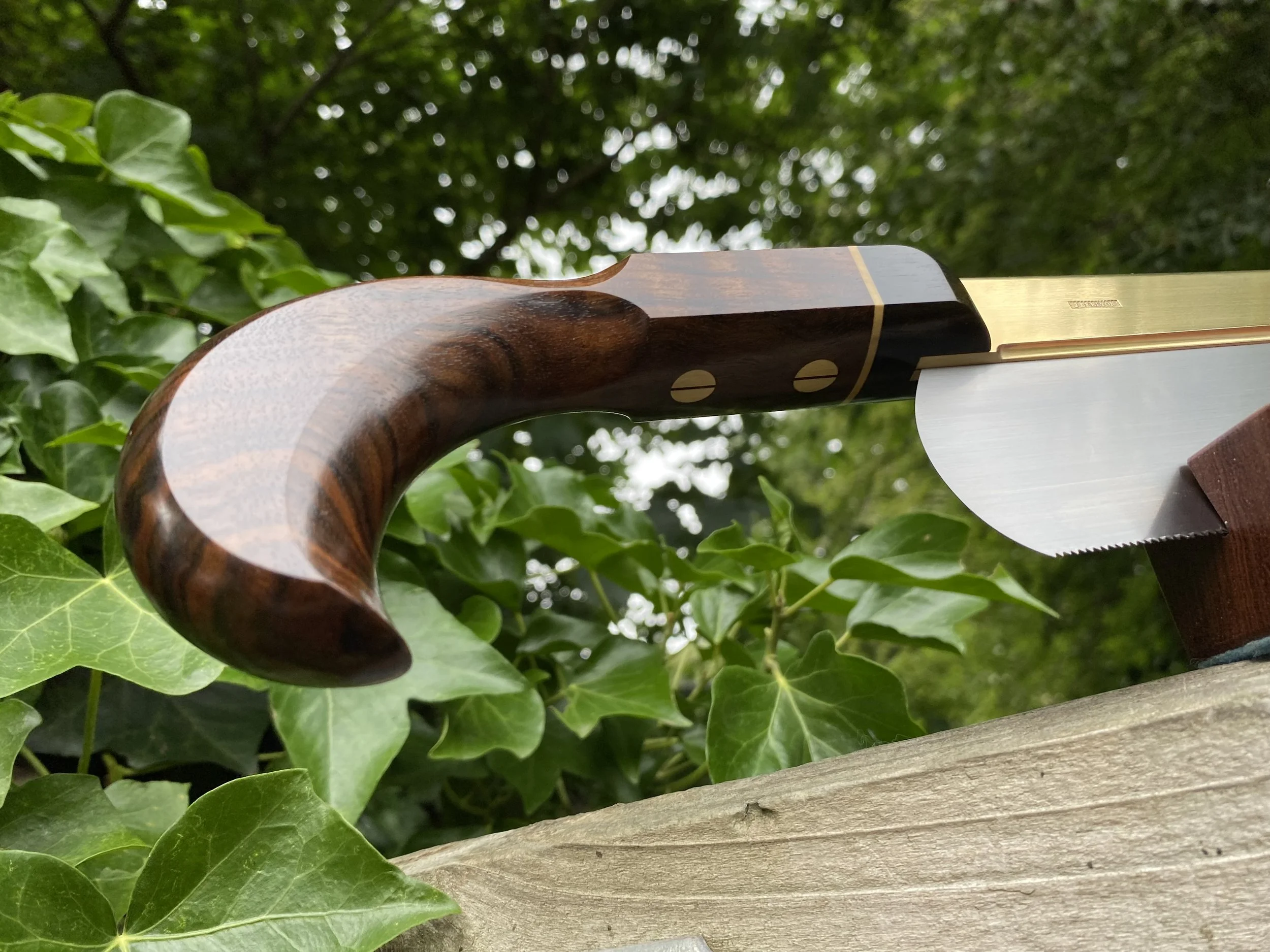 Inspired by the shape of an 18th Century pocket pistol, The Bennet 9, pays homage to one of literatures most revered female protagonists, Elizabeth ‘Lizzy’ Bennet. Owing to its deeper tapered brass back, The Bennet 9 whilst being a smaller, finer and nimble saw and with just a 9” blade length, still retains a sturdy balance in the hand. The Bennet 9 boasts four masterfully hand-carved spear profiles on the handle and is the only birds head pistol grip saw that we craft. This design allows for the whole of the hand to fit comfortably into an elegantly curved grip. With its finely hand-cut teeth, this saw is ideal for precise joints in smaller scale furniture joinery and box work.