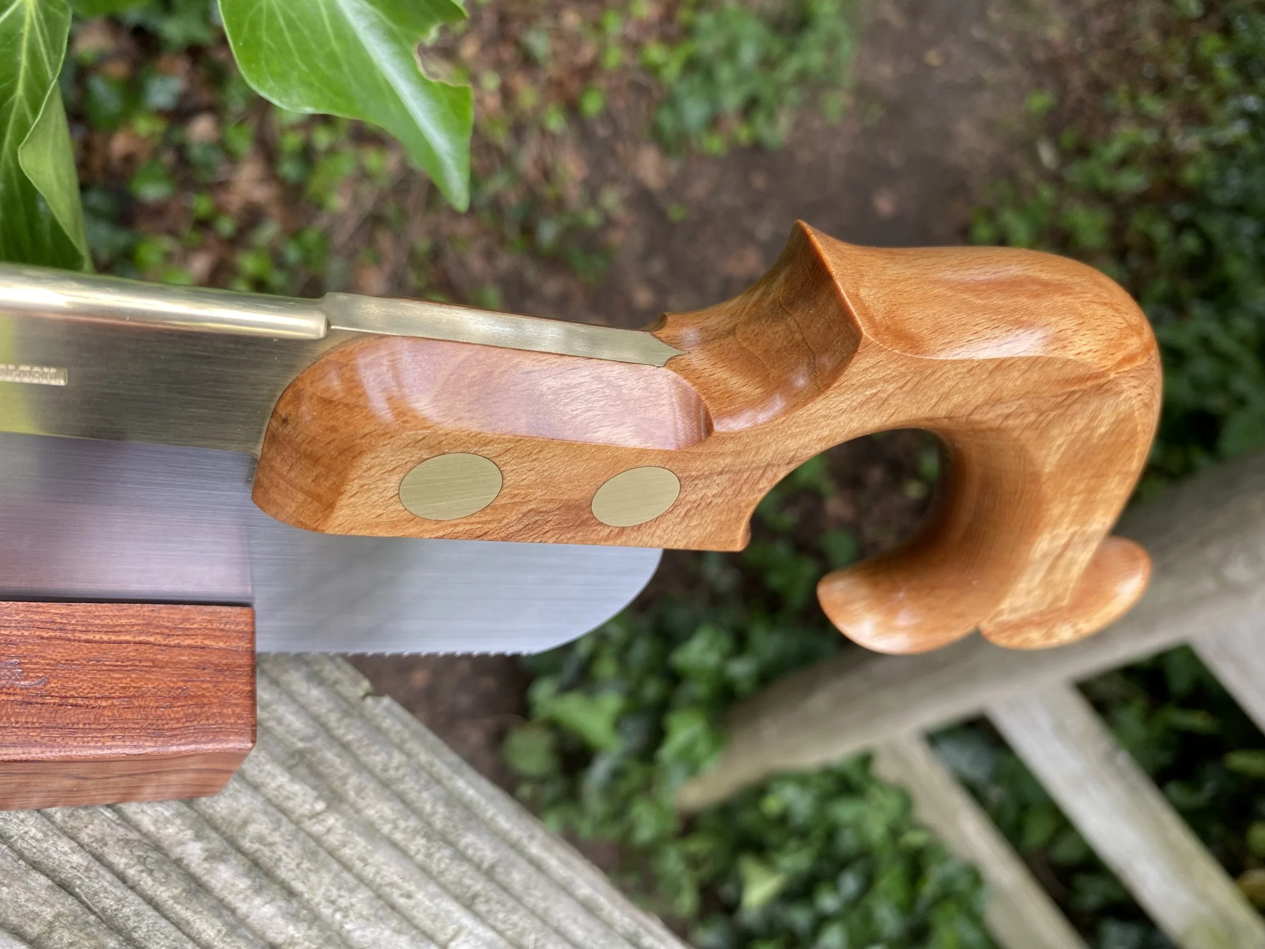 An 11” Dovetail Saw, named in honour of Fitzwilliam Darcy, the romantic hero of Jane Austen’s novel ‘Pride & Prejudice’ With its sweeping, elegant lines that engage with each other throughout, The Darcy 11 has an open pistol grip handle with a lower horn only, allowing for more ease especially when cutting lap dovetail joints at the bench. The hand engages both comfortably and ergonomically in the handle with the users final thumb placement resting effortlessly on a shallow curve behind the front peak.