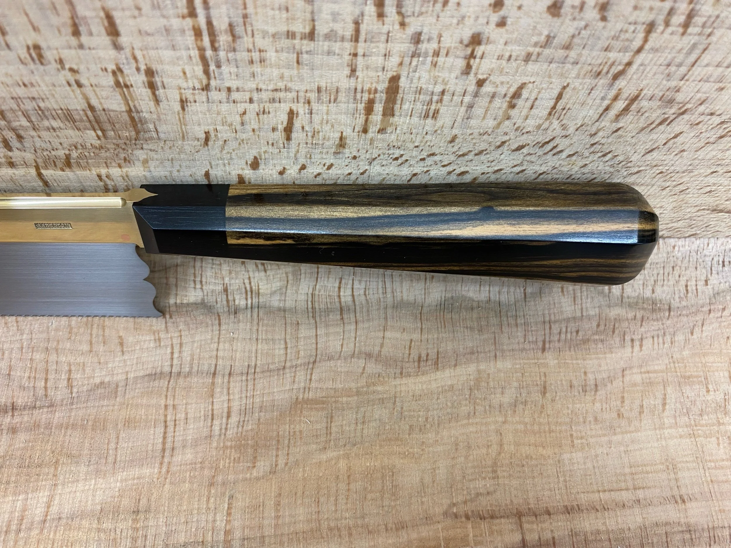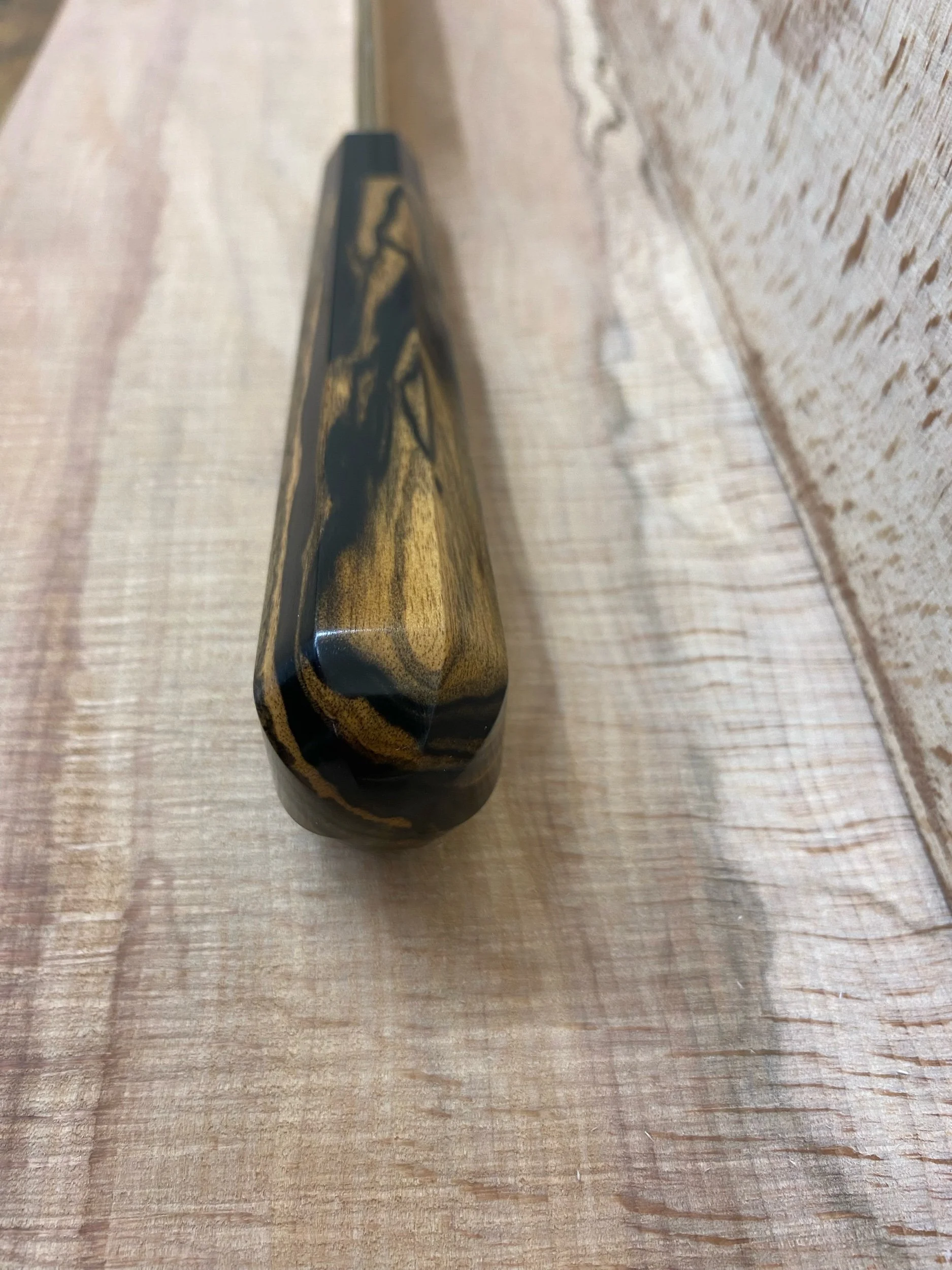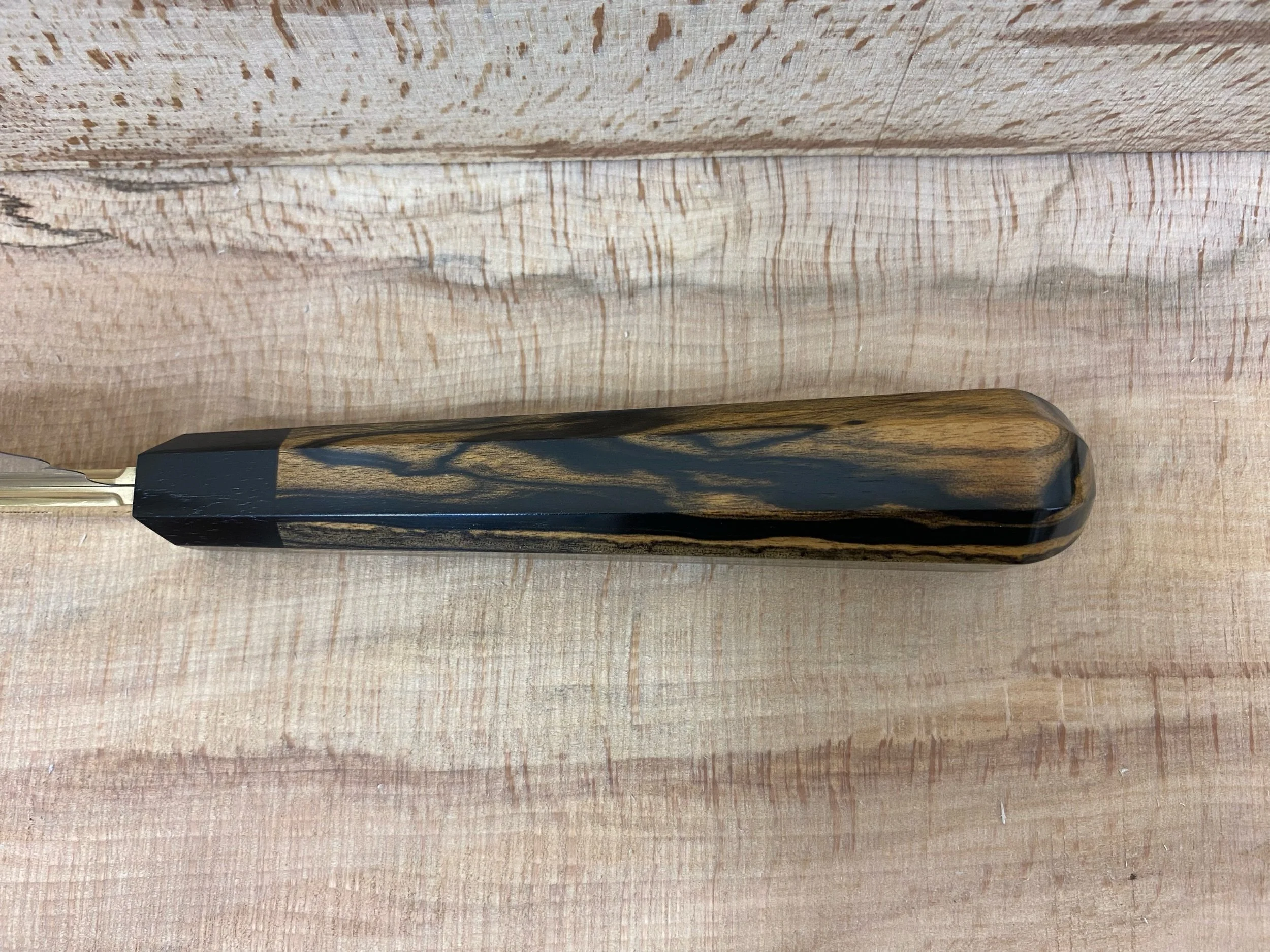 Tapered semi-symmetrical octagonal handle in a choice of high-grade timbers either single timber species or a second timber species can be added for the last inch as a collar adjacent to the brass