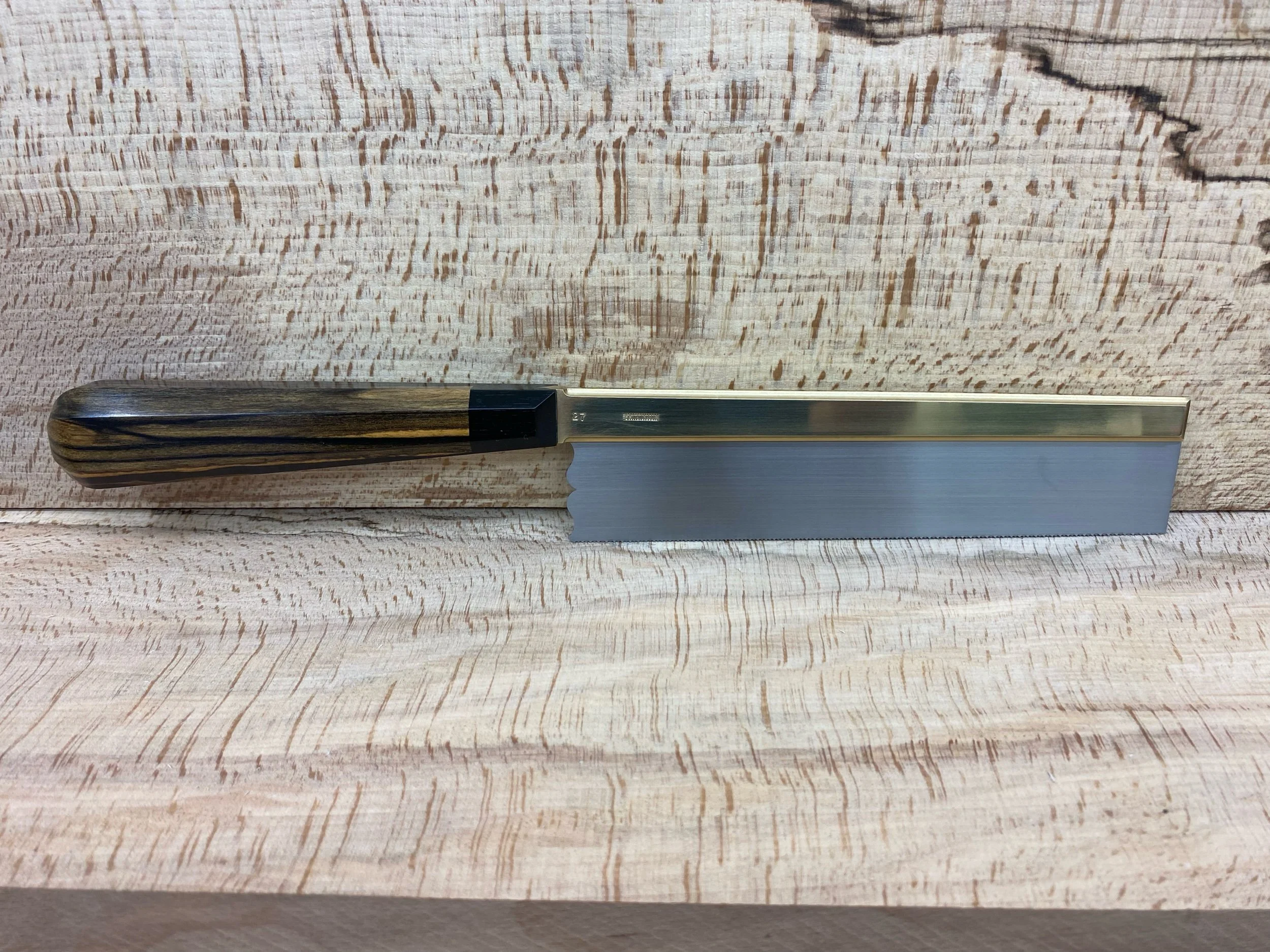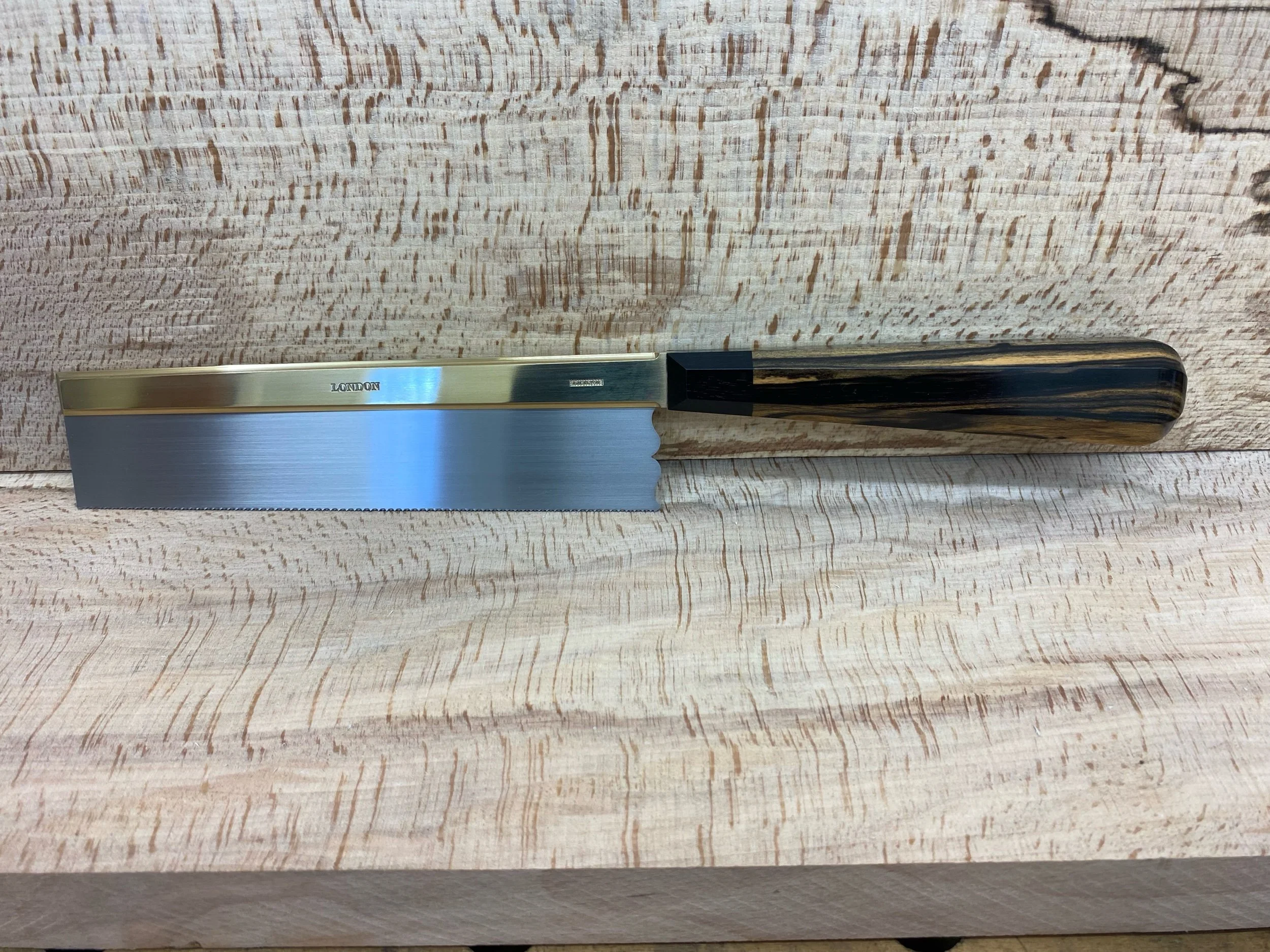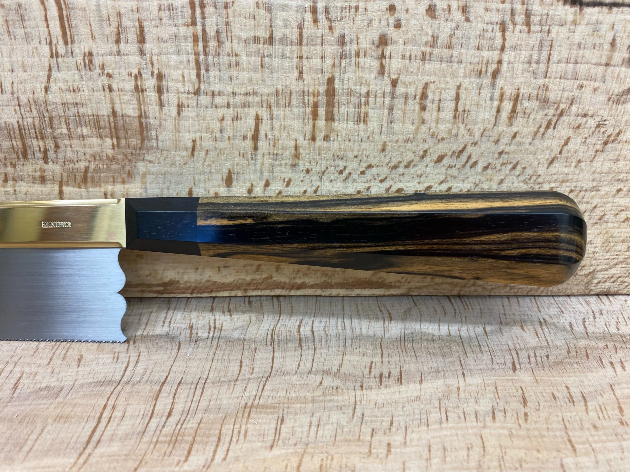 Tapered semi-symmetrical octagonal handle in a choice of high-grade timbers either single timber species or a second timber species can be added for the last inch as a collar adjacent to the brass